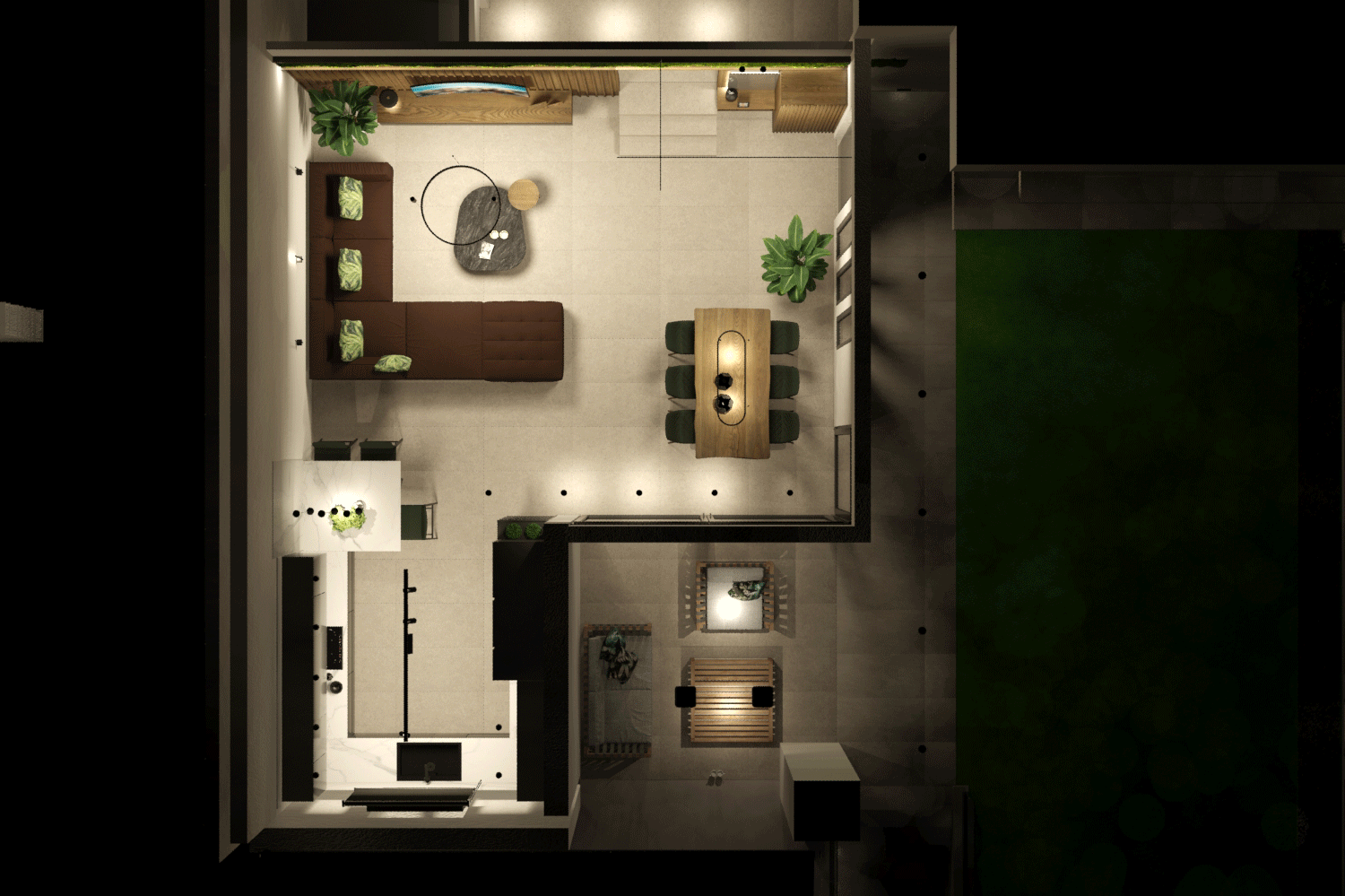 O χώρος πάνω έχει σαλόνι- κουζίνα, 2 δωμάτια μια κρεβατοκάμαρα, 2 τουαλέτες